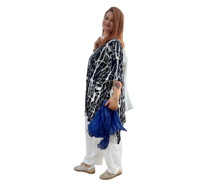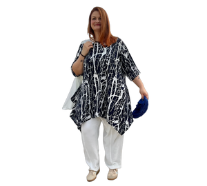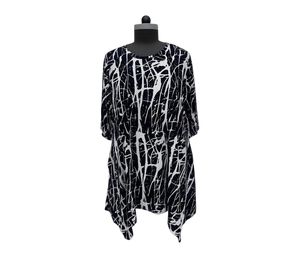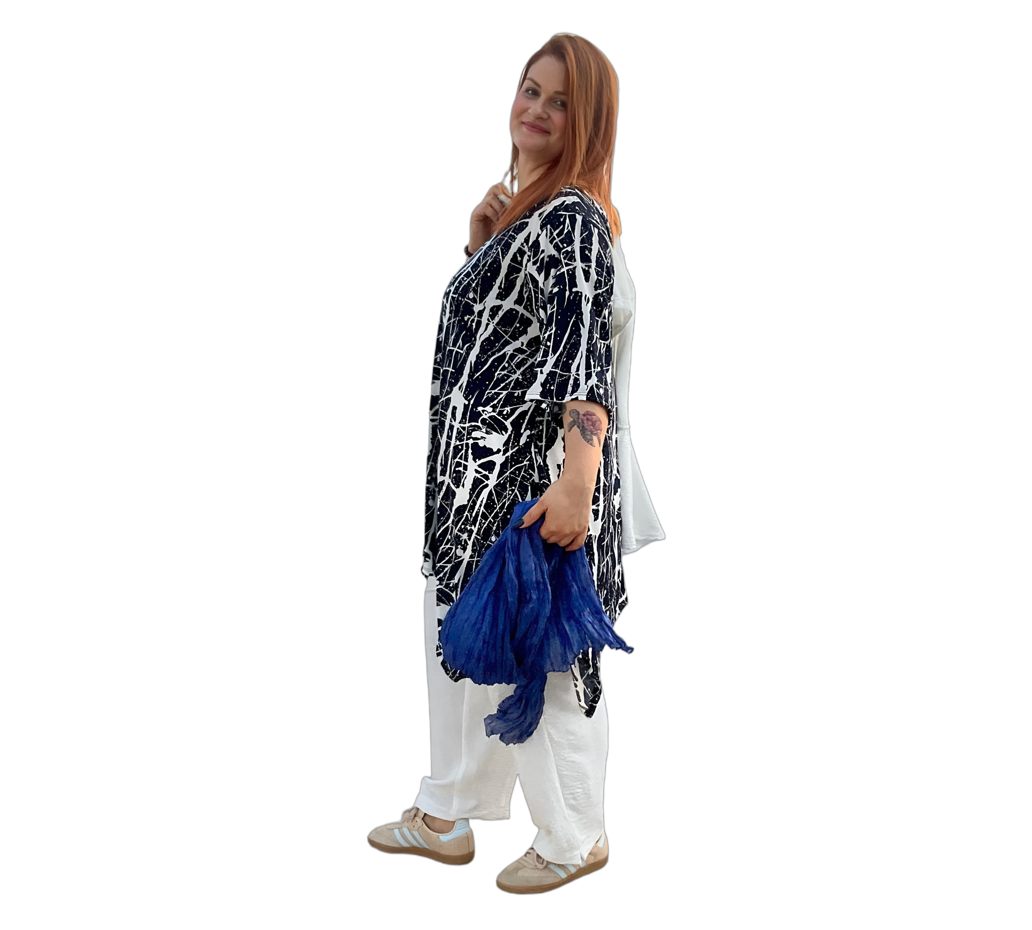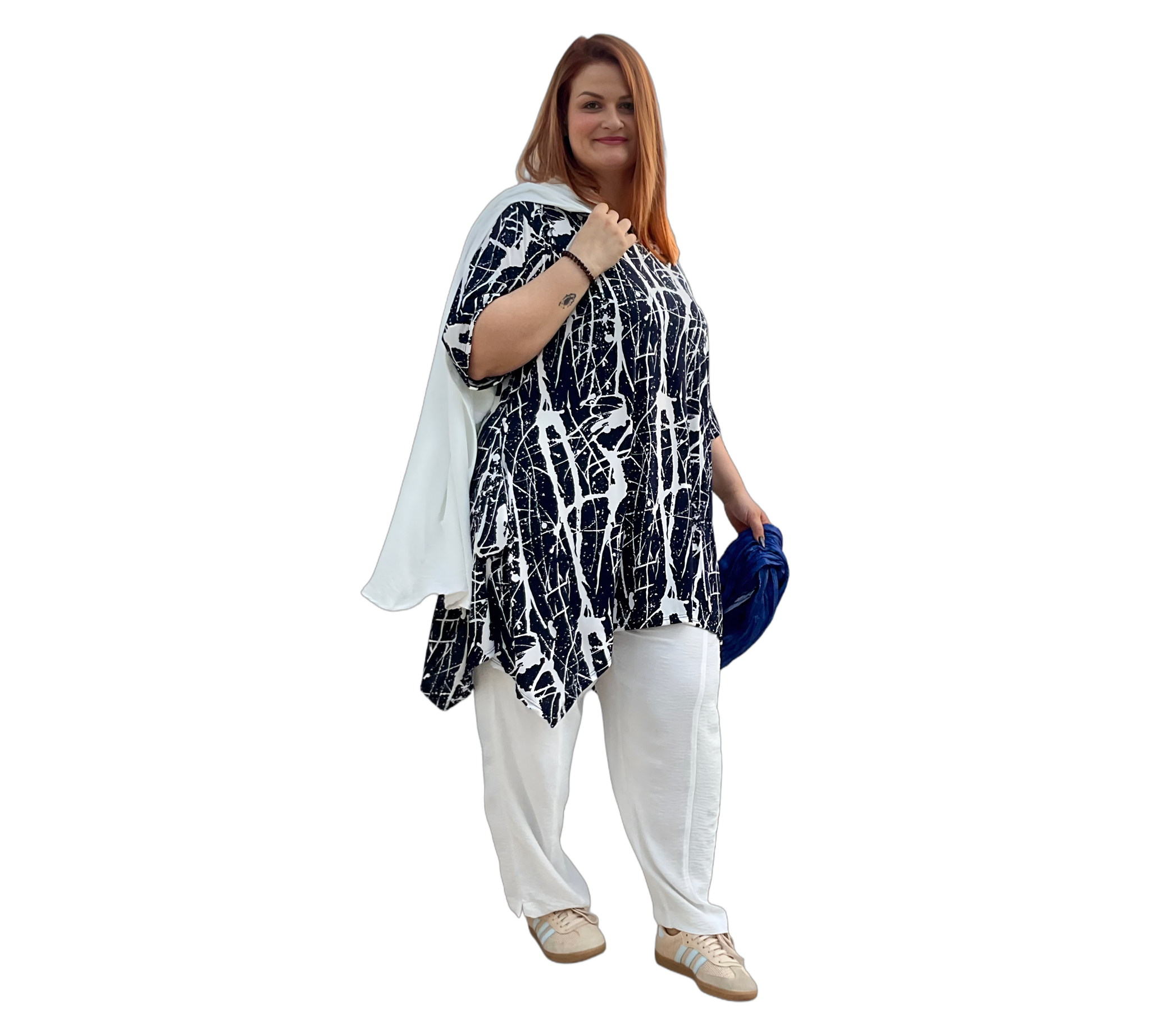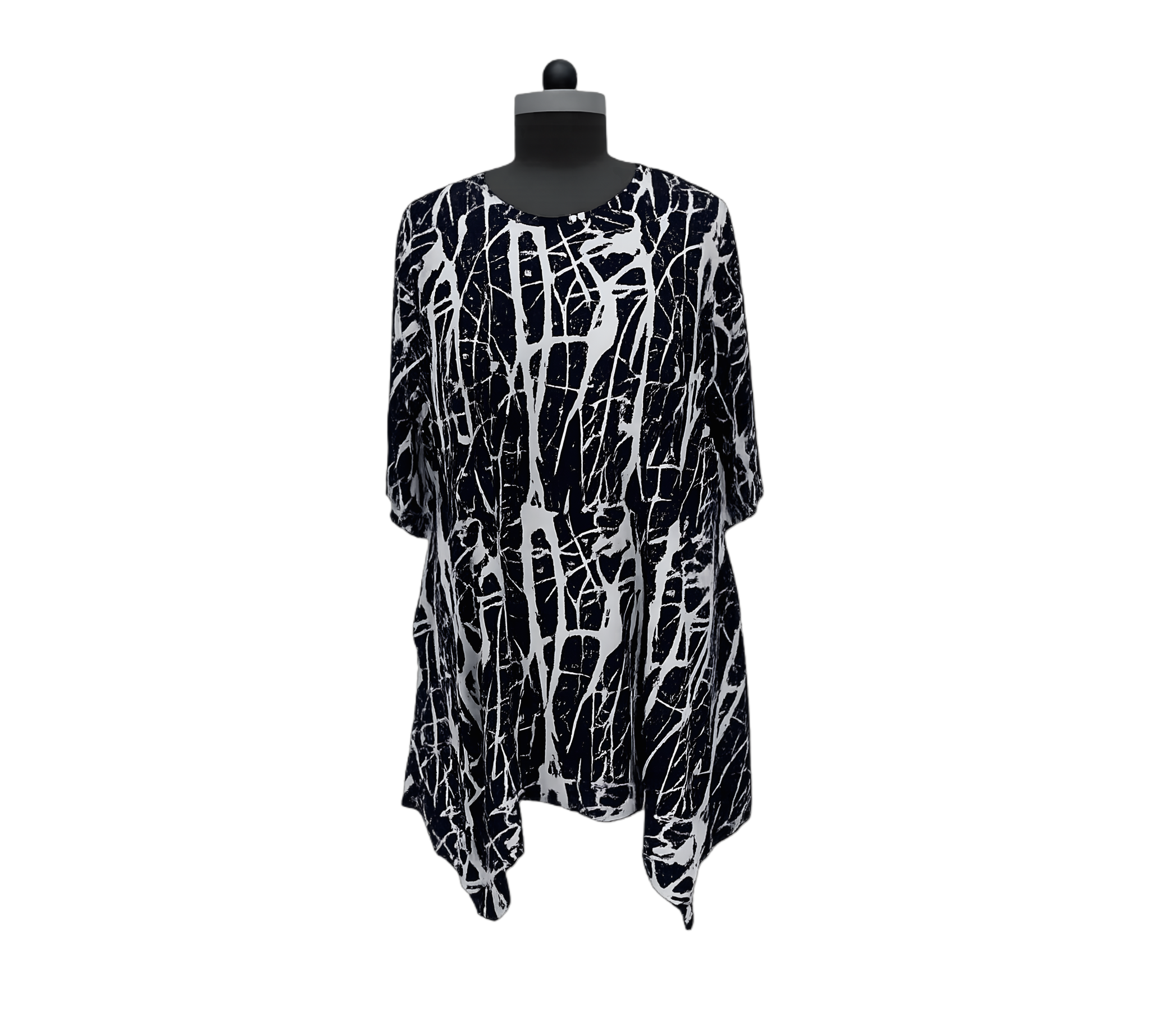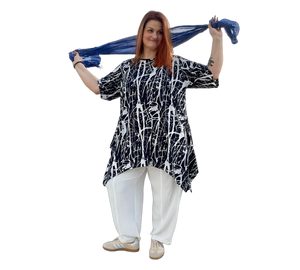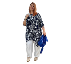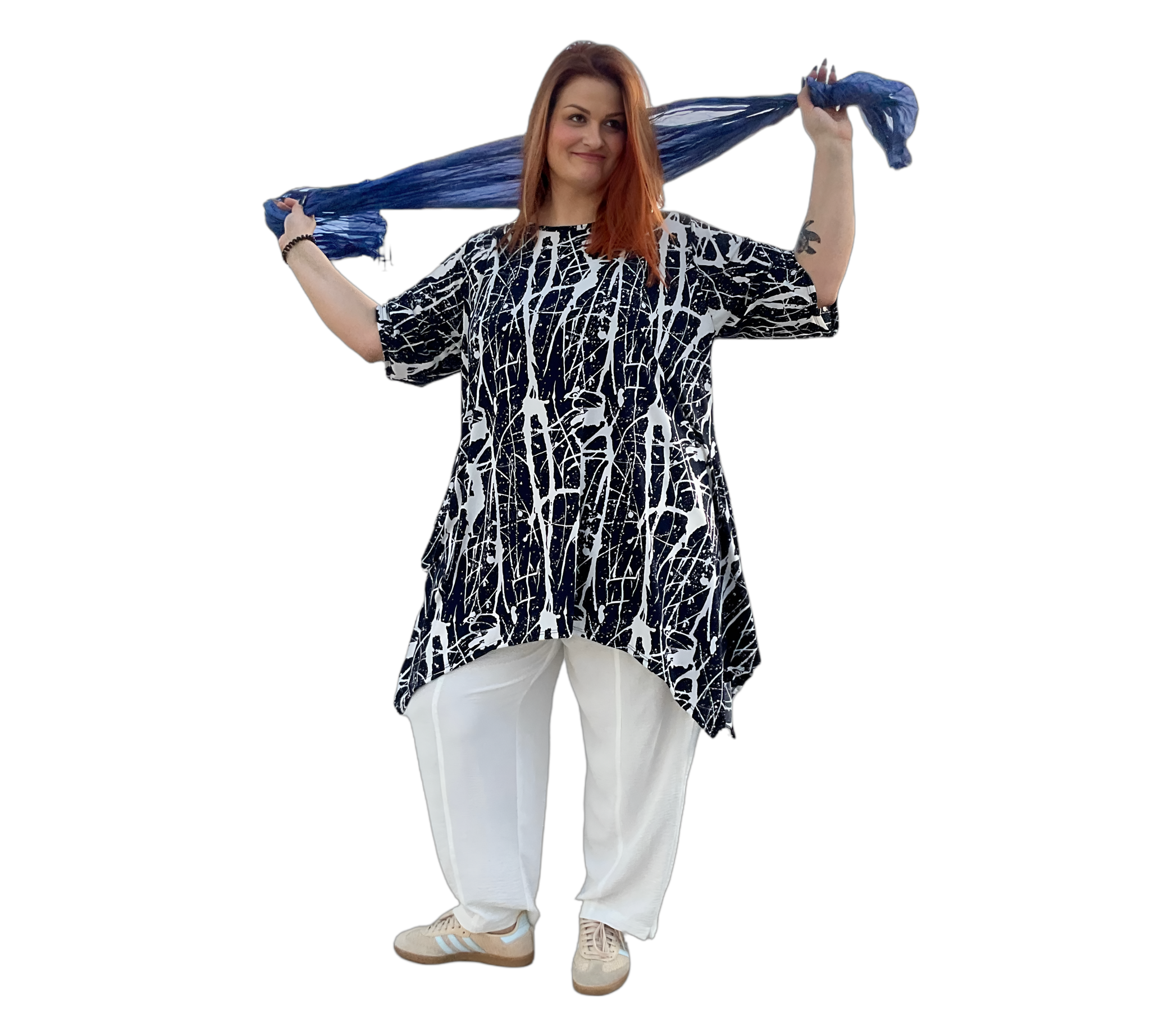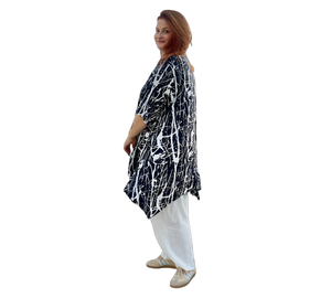 Modernes, locker geschnittene Tunika mit auffälligem abstraktem marine-Weiß-Muster. Der runde Ausschnitt, die 3/4-Ärmel und der asymmetrische Saum sorgen für einen stilvollen, fließenden Look. Angenehm zu tragen und vielseitig kombinierbar – ideal für Alltag und besondere Anlässe.