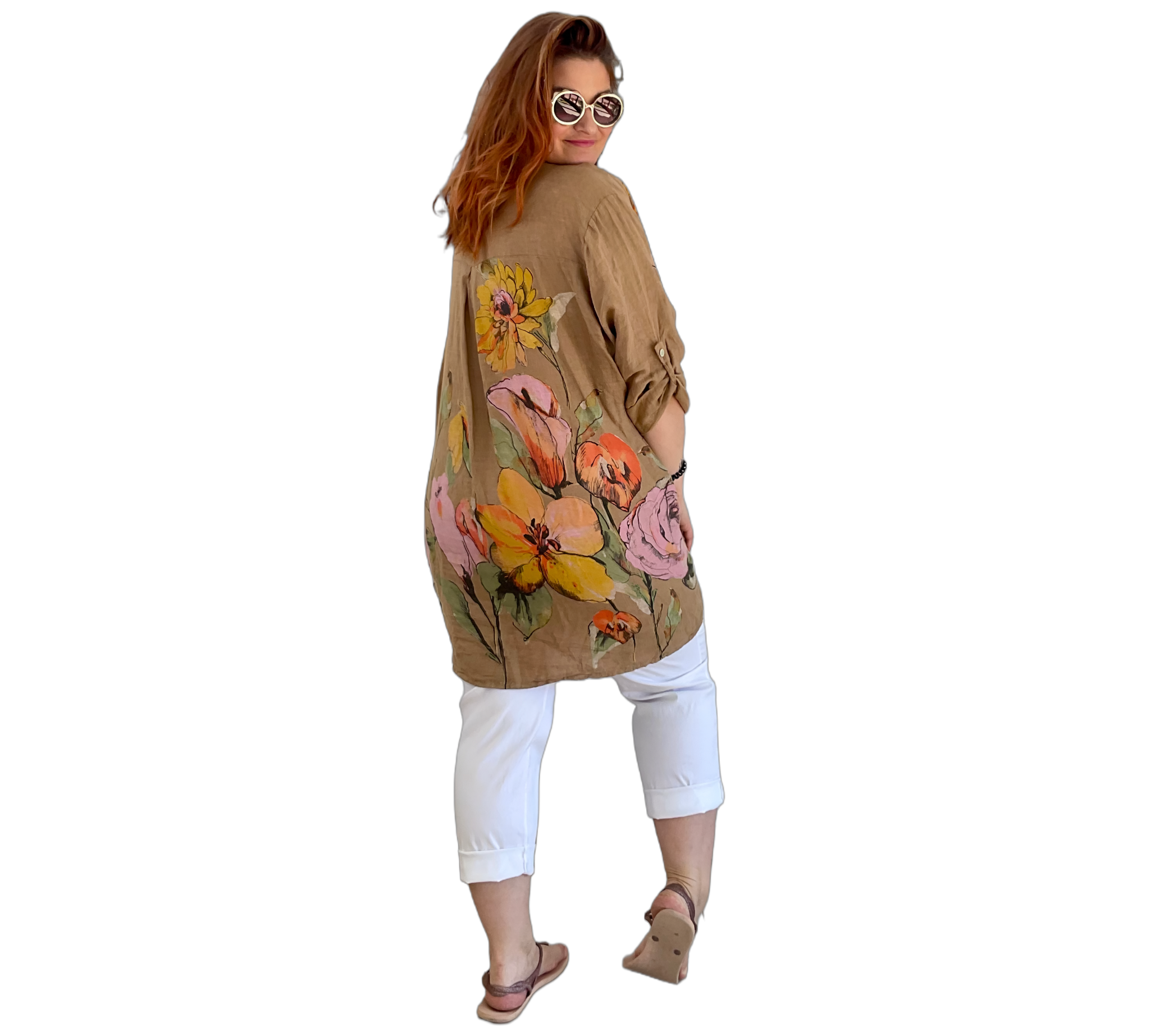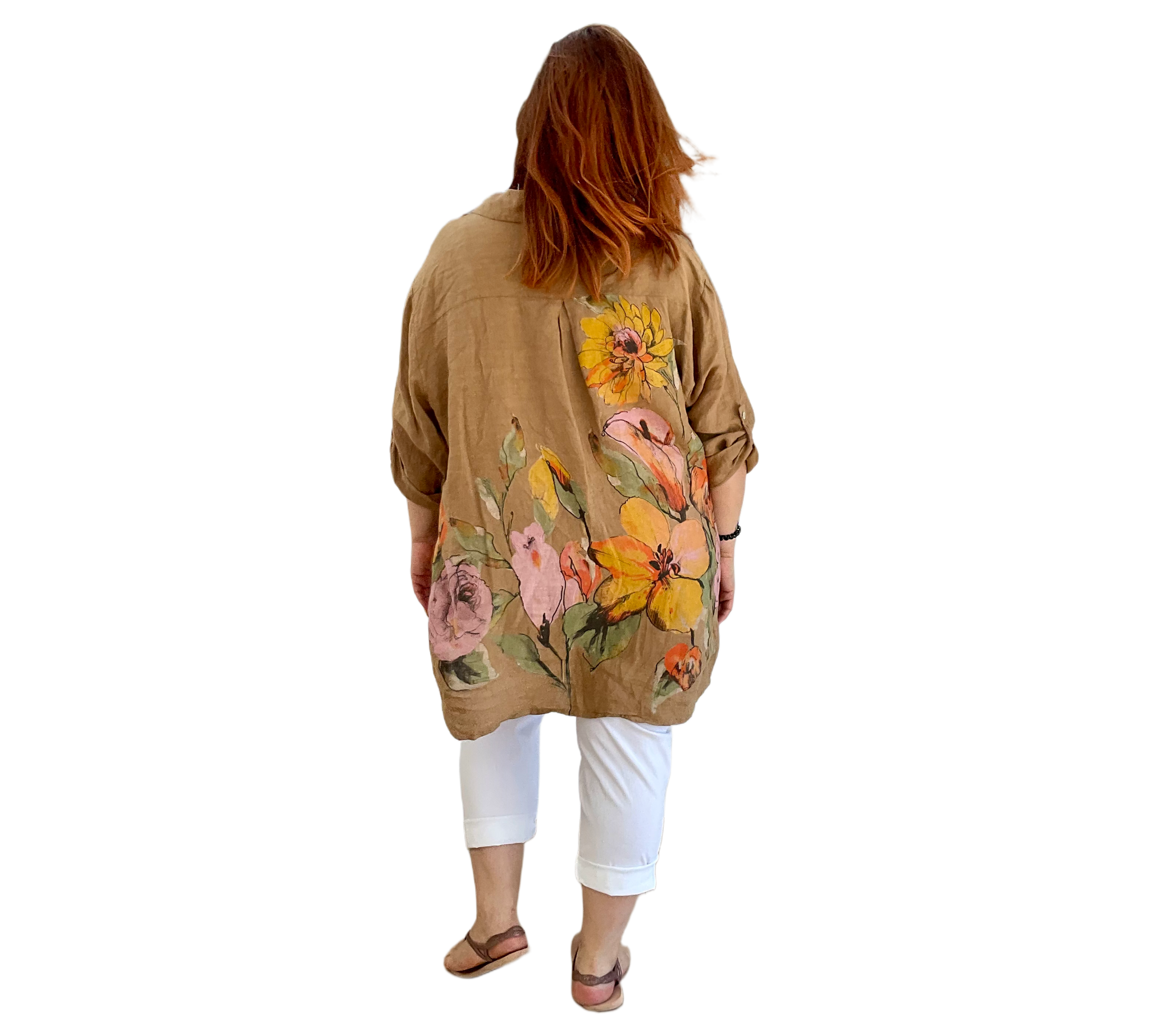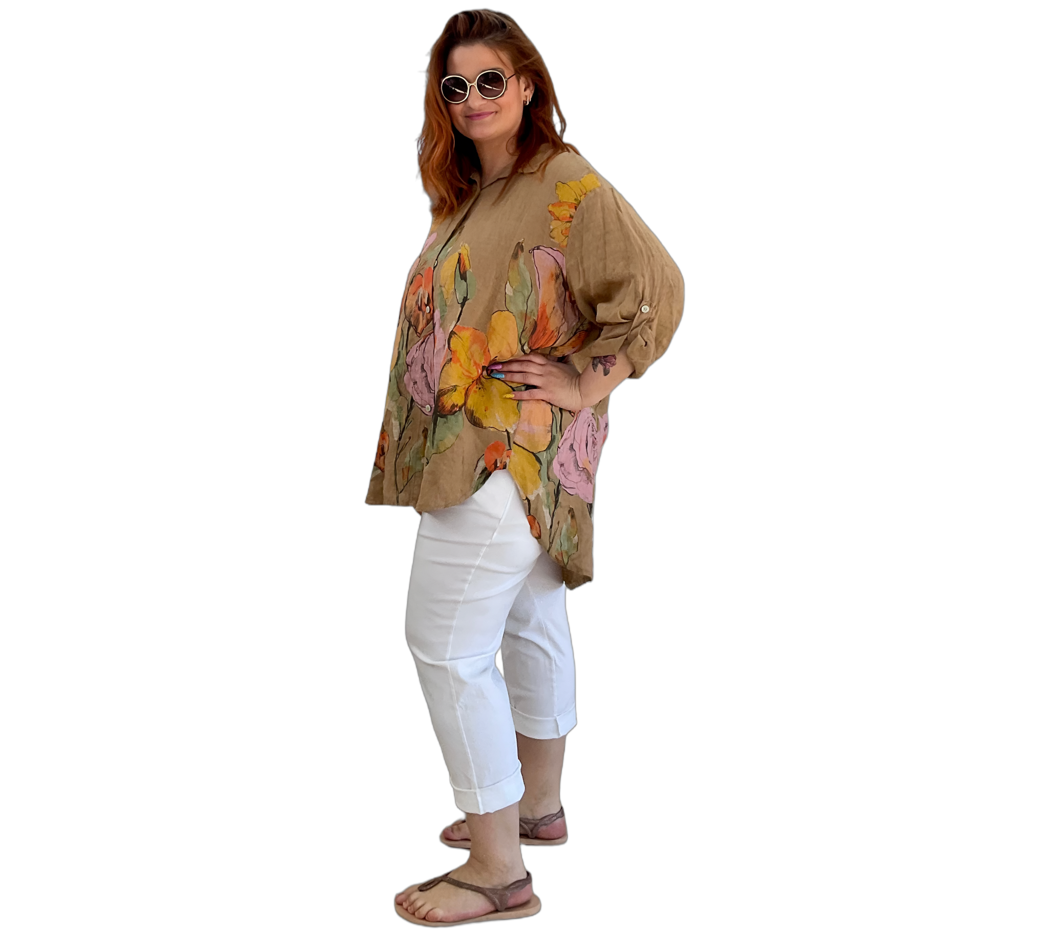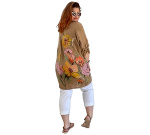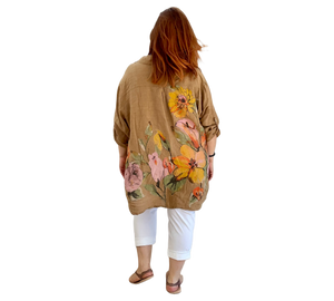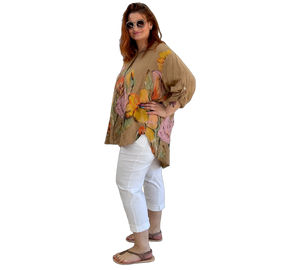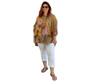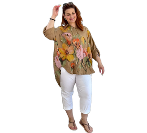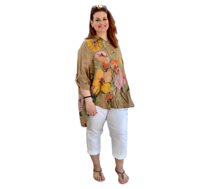 Luftige Hemd Bluse aus 100 % Leinen mit großem, farbenfrohem Blumenmuster. Der lockere Schnitt sorgt für eine bequeme Passform und ein angenehmes Tragegefühl. Leicht, atmungsaktiv und ideal für warme Tage – ein stilvoller Hingucker für entspannte und sommerliche Looks.