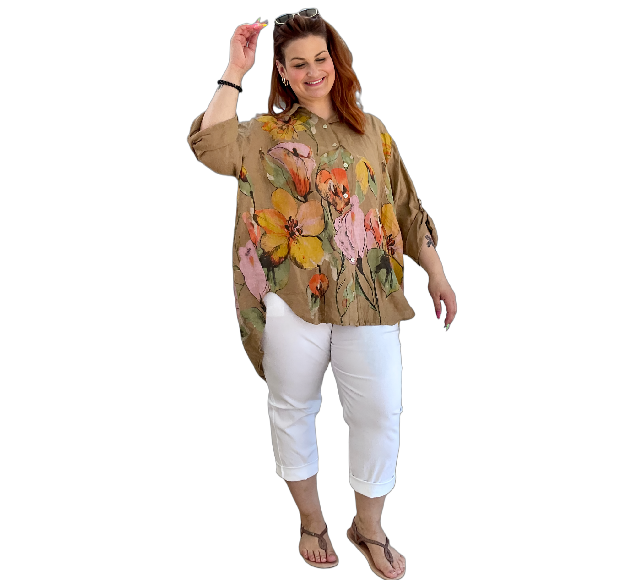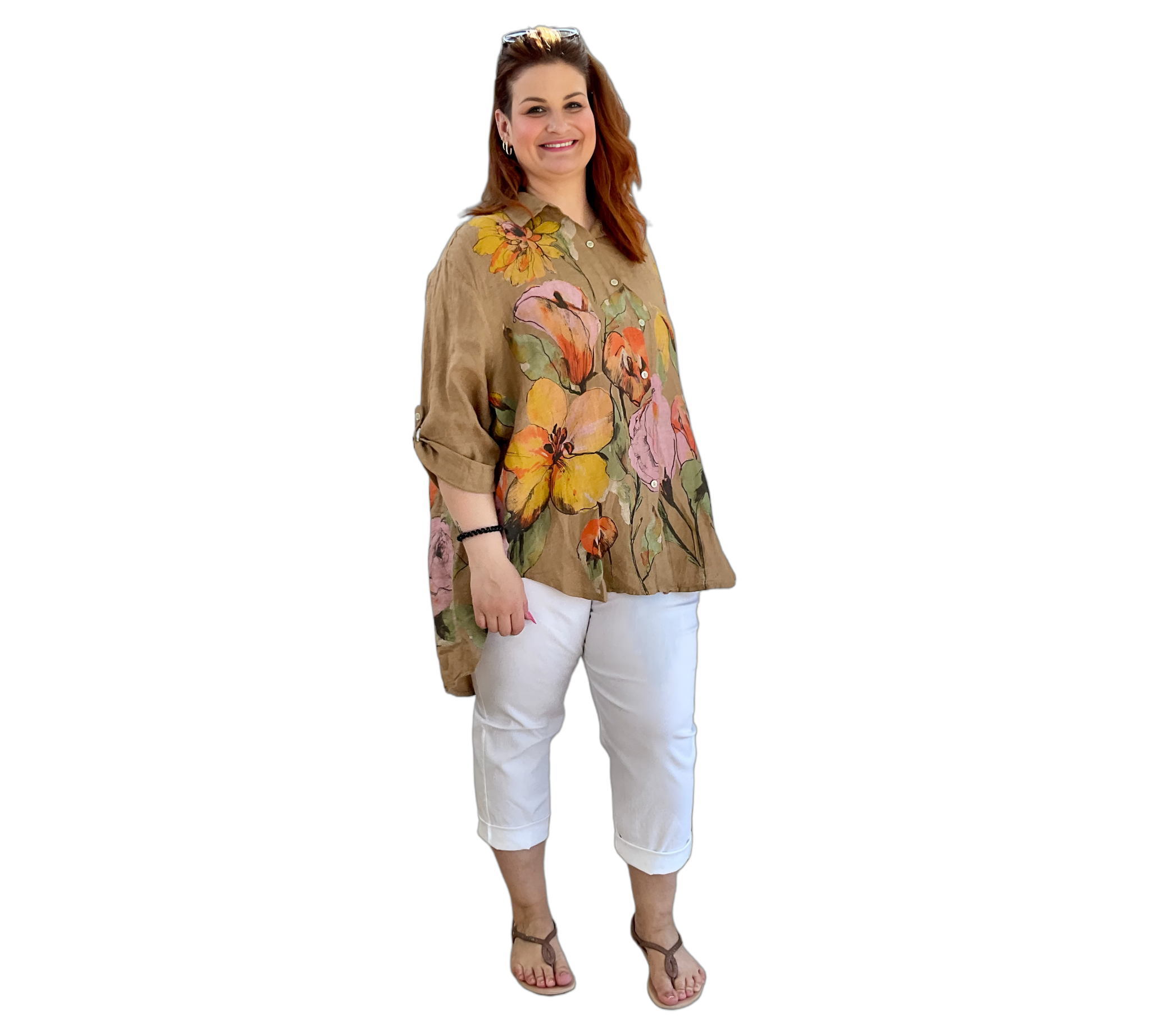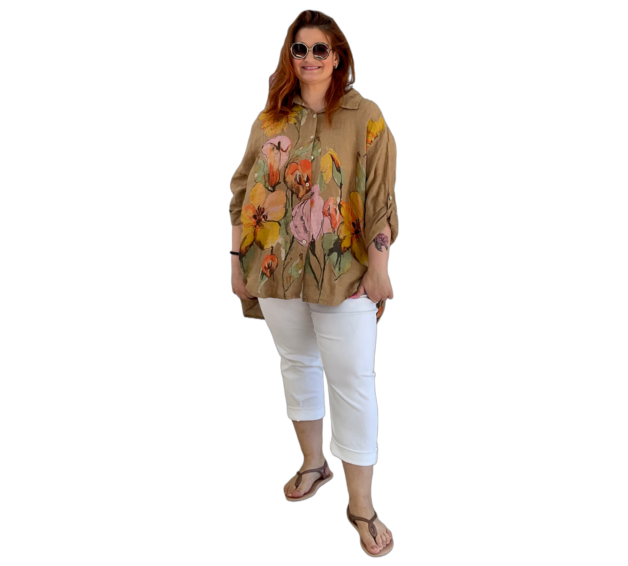 Luftige Hemd Bluse aus 100 % Leinen mit großem, farbenfrohem Blumenmuster. Der lockere Schnitt sorgt für eine bequeme Passform und ein angenehmes Tragegefühl. Leicht, atmungsaktiv und ideal für warme Tage – ein stilvoller Hingucker für entspannte und sommerliche Looks.