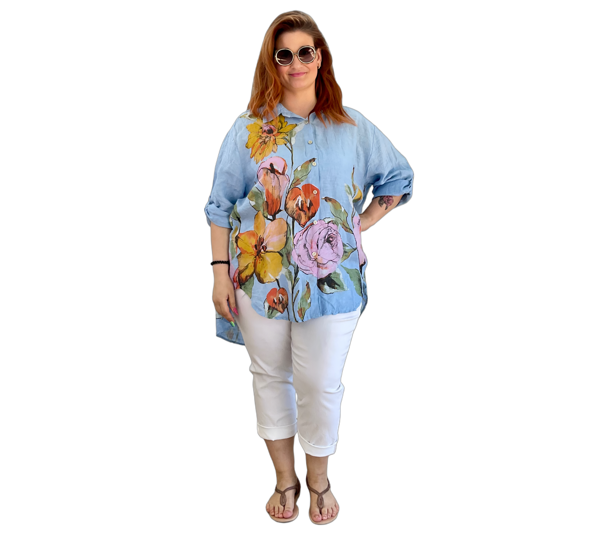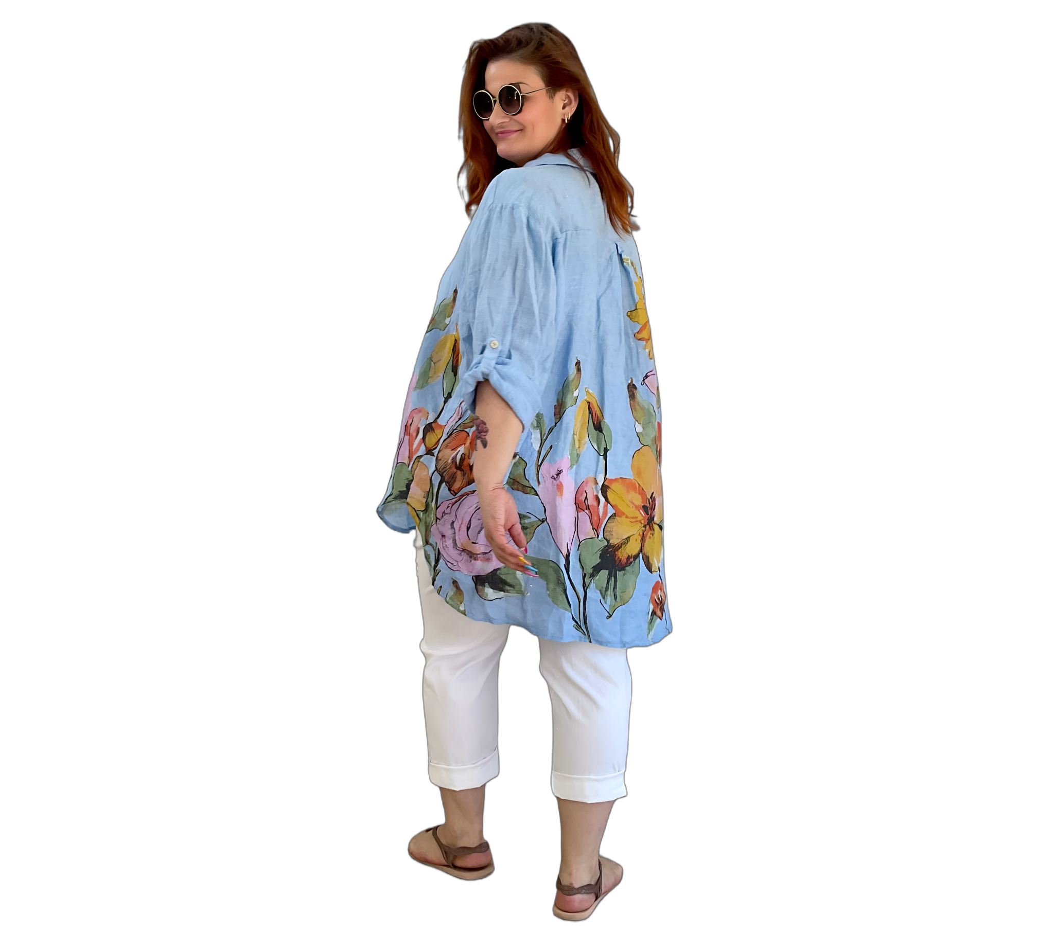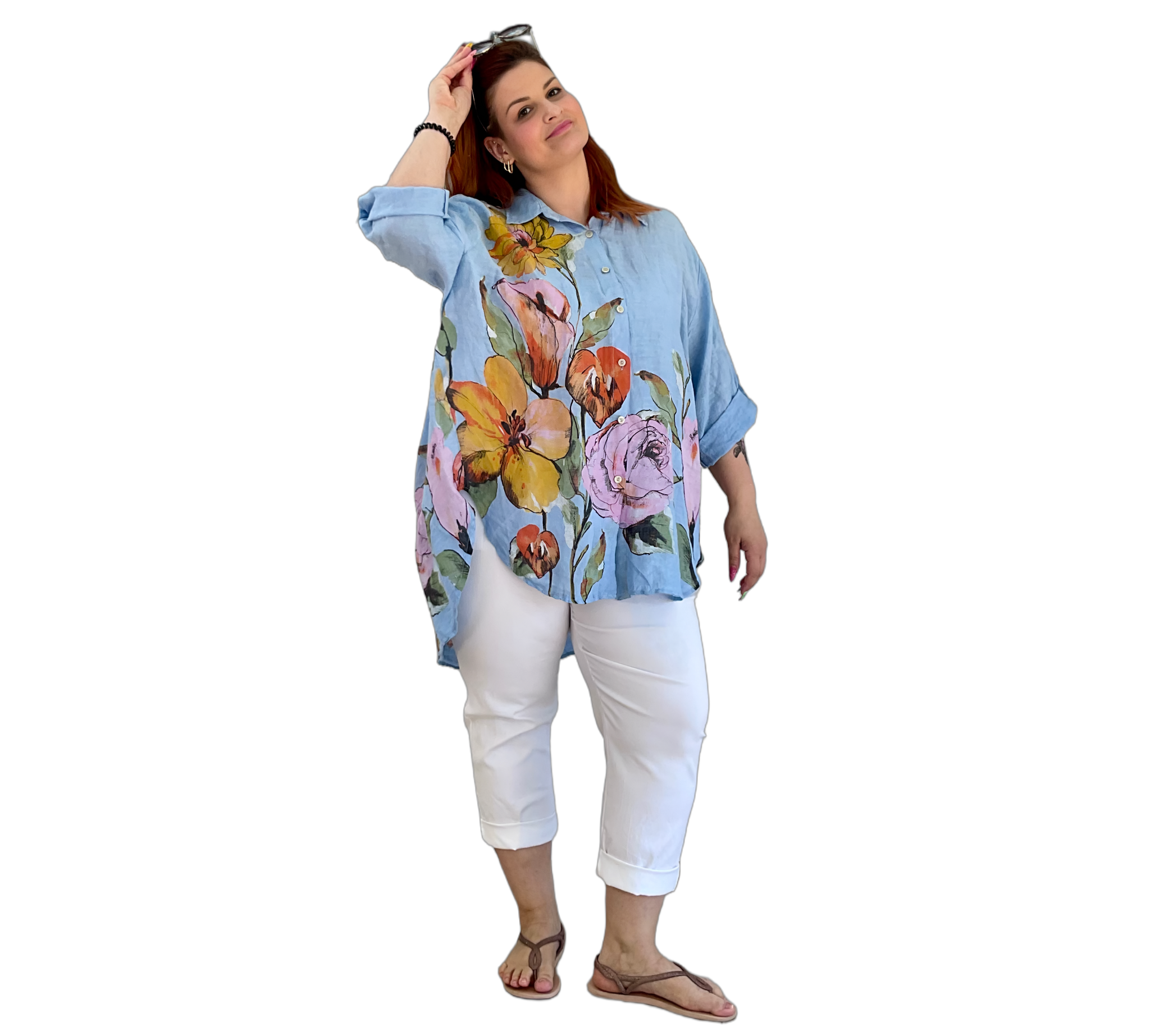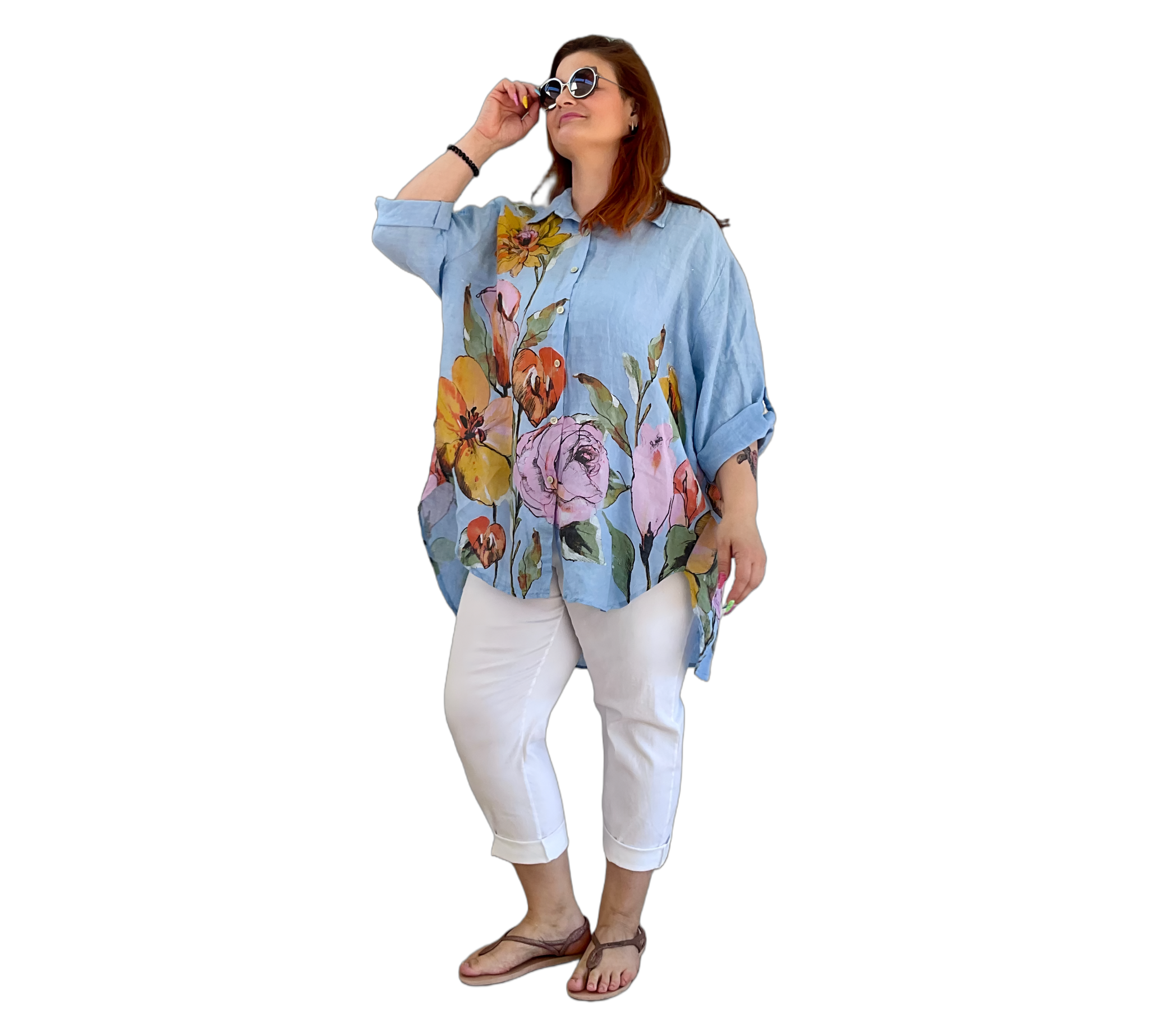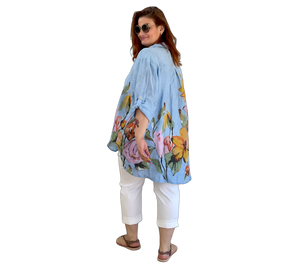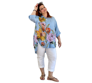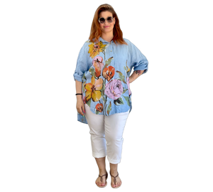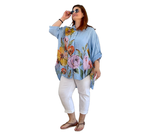 Luftige Hemd Bluse aus 100 % Leinen mit großem, farbenfrohem Blumenmuster. Der lockere Schnitt sorgt für eine bequeme Passform und ein angenehmes Tragegefühl. Leicht, atmungsaktiv und ideal für warme Tage – ein stilvoller Hingucker für entspannte und sommerliche Looks.